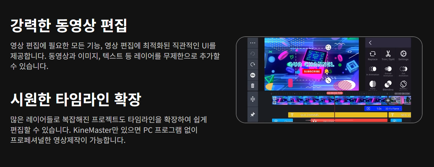 키네마스터는 타임라인 기반 편집을 제공해 직관적인 조작이 가능하며, 영상 자르기, 자막 삽입, 음악 추가, 필터, 전환 효과, 속도 조절, 배경 제거 등 거의 모든 편집 기능을 모바일에서 구현할 수 있습니다.