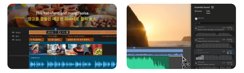- AI 기반 자동화: 2025 최신 버전부터는 Adobe Sensei AI가 적용돼 자동 컷 편집, 오디오 정리, 자막 생성 기능을 지원합니다.