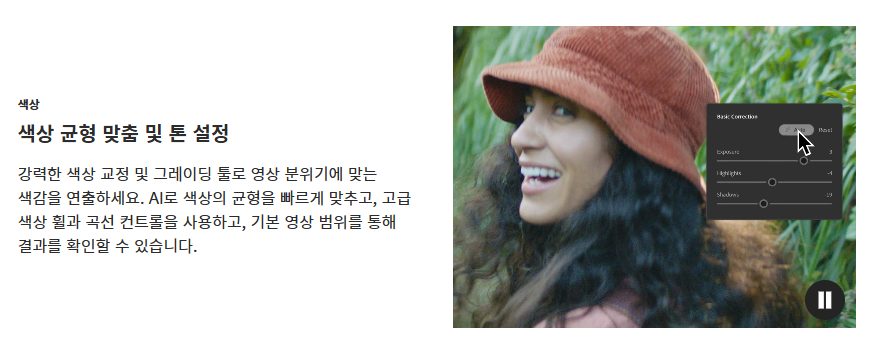 - 색보정 도구: Lumetri 컬러 패널을 통해 전문가 수준의 색보정이 가능하며, LUT를 통한 프리셋 적용도 쉽습니다.